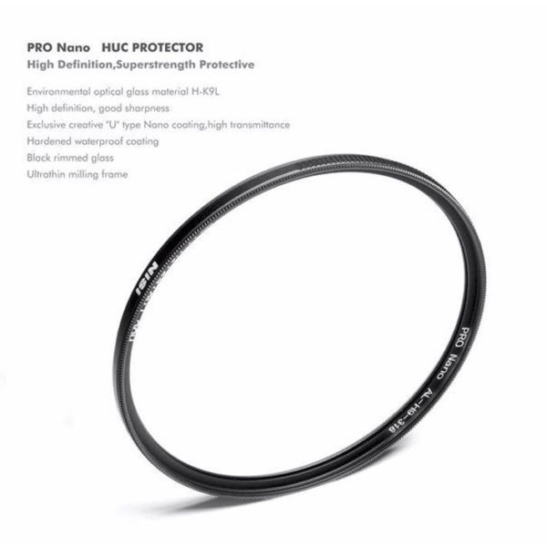 NiSi Pro Nano HUC Protector filter er utformtt for å gi den beste beskyttelsen mot støv eller annen påvirkning på objektivets fremre linseelementet. Produsert av optisk glass i beste kvalitet og med nanobelegg på begge sider. Dette bidrar til at hele 99,3% av lyset passerer gjennom filteret. Filterringen er produsert i aluminium av beste kvalitet og med en tykkelse på kun 3,5mm, noe som gjør at dette ultratynne filteret også passer perfekt på kraftige vidvinkelobjektiv uten å skape vinjettering. Ringen har dessuten en superfin matt polering (som forhindrer refleksjon) og gjennomarbeidet rifling for å sørge for at rammen ikke blekner på grunn av slitasje.
